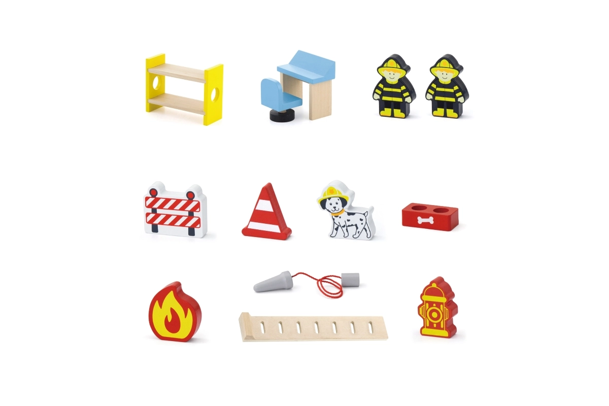 V paketu najdete vse za takojšnjo igro: stavbo postaje, 2 gasilca, helikopter, gasilski avto, hidrant, pograd, stol, nadzorno ploščo in lestev. Materiali in barve so varni in netoksični, zato se lahko otroci igrajo brez skrbi. Odlična izbira za darilo, ki razveseli in hkrati traja.