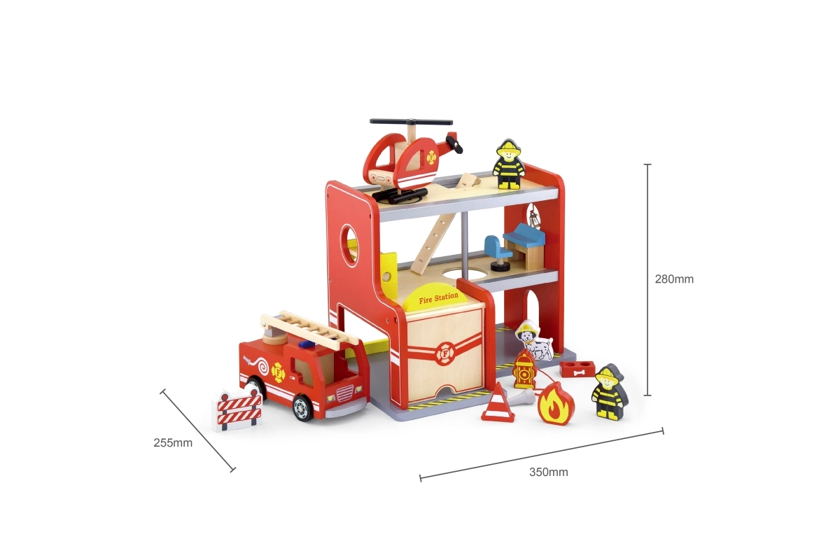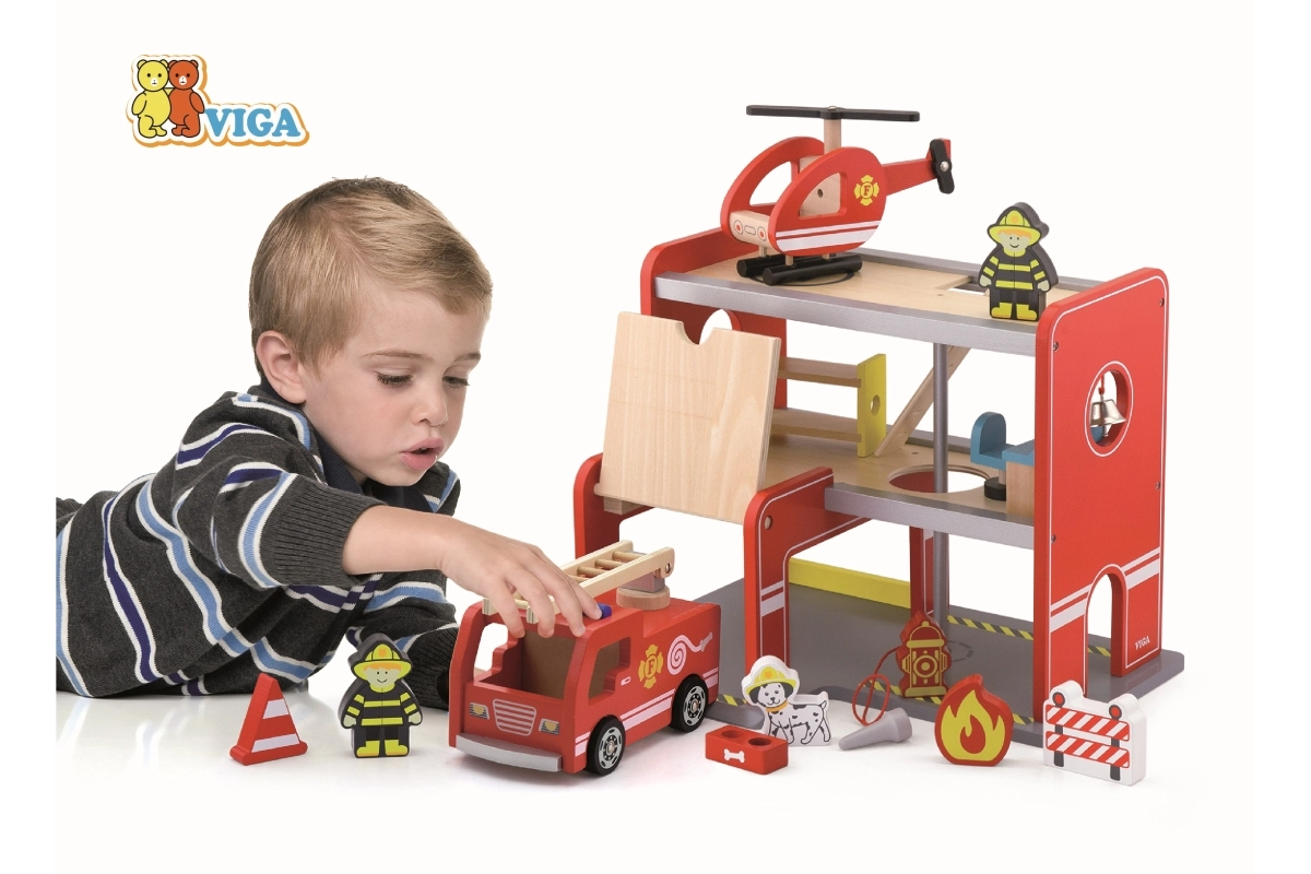 Lesena gasilska postaja Viga je celovit igralni komplet z več nadstropji, ki podpira vloge v igri, razvoj fine motorike in domišljije. Otroci lahko zapeljejo iz garaže z avtom, pristanejo s helikopterjem na zgornji ploščadi in se po cevi spustijo naravnost k posredovanju. Barviti detajli in kakovostna lesena konstrukcija zagotavljajo privlačen videz ter odpornost pri vsakodnevni uporabi.