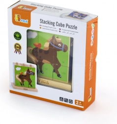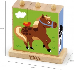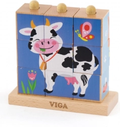 Lesene natakljive kocke VIGA z motivi domačih živali ponujajo zabavno sestavljanje 4 slik iz 9 kock na trdni osnovi iz bukovega lesa. Nagibni količki olajšajo obračanje kock in spodbujajo razvoj fine motorike, logičnega mišljenja ter potrpežljivosti. Primerno od 24 mesecev.