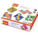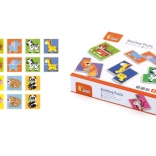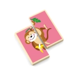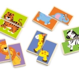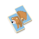 Ta komplet vsebuje lesene koščke z živalmi, ki se med seboj ujemajo in sestavljajo v preproste pare. Otroci na igriv način urijo koordinacijo oko–roka, zbranost in vizualno zaznavanje. Deli so dovolj veliki za majhne otroške roke in imajo gladke, varne robove.