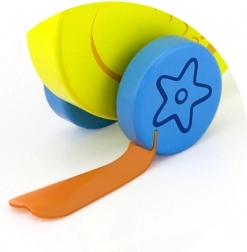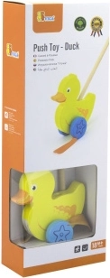 Leseni potisni raček na palici je preprosta, a učinkovita igrača, ki bo všeč vsakemu otroku. Gre za klasično igračo, ki prinaša številne prednosti. Prisrčen rumen raček ob premikanju energično premika nožice, kar otroke motivira k sprehodom. Igrača je pakirana v estetski škatli z okencem, ki omogoča pogled na račkico. V notranjosti je palica z ročajem, ki popolno sede v majhno otroško roko. Palica ni trajno pritrjena, kar olajša shranjevanje. Celotna igrača je izdelana iz bukovega lesa in premazana z nestrupenimi barvami v živih odtenkih, ki pritegnejo pozornost in spodbujajo k igri, kar prinaša veliko veselja.