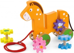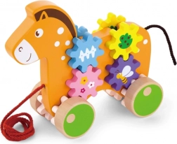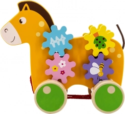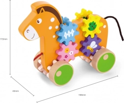 Konjiček ima pisane zobnike, ki se obračajo med premikanjem igrače, kar pomaga malčkom razvijati njihove motorične spretnosti.