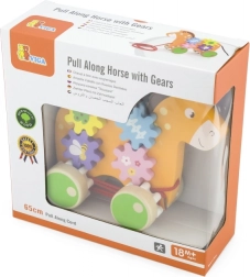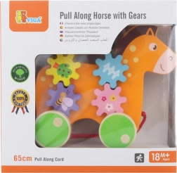 Dolžina vrvice je 65 cm, kar omogoča enostavno vlečenje tudi za najmlajše otroke. Izrazito barviti zobniki ne le krasijo stran konjička, temveč tudi podpirajo razvoj otrokovih motoričnih sposobnosti, saj se med gibanjem obračajo.