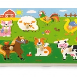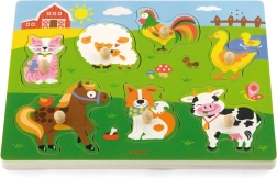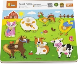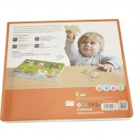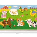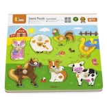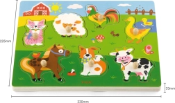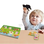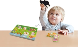 Lesena vstavljanka z živalmi, z zvokom. Ko pravilno vstaviš žival, se oglasi zvok, ki ga žival oddaja. Dimenzije plošče približno 30 x 22,5 x 2 cm. Napajanje 2 x AAA bateriji (nista priloženi). Dimenzije embalaže približno 30 x 27 x 2 cm. Starost 18m+