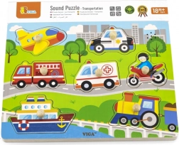 Zaradi lesenih ročajev se otroci naučijo pravilno manipulirati s posameznimi kosi in prepoznati zvoke prevoznih sredstev.