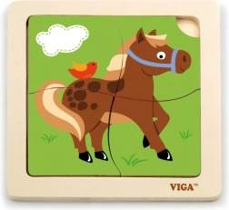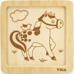 Ta kompaktna lesena sestavljanka z veselým konjičkom je idealna prva uganka za malčke. Veliki in gladki koščki se udobno držijo v malih rokicah in vstavijo v stabilen lesen okvir, ki olajša pravilno umeščanje.