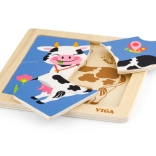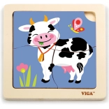 Lesene puzzle se sestavijo v prikupno sliko kravičke, kar spodbuja ustvarjalnost.