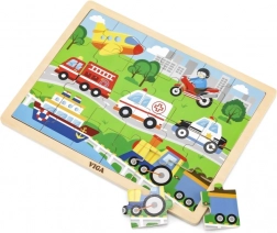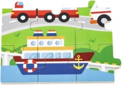 Ta lesena sestavljanka z motivi prevoznih sredstev je odlična izbira za prve “večje” puzzle. S 24 kosi je sestavljanje ravno pravšen izziv – podpira zbranost in veselje ob dokončani sliki v velikosti približno 27,5 × 20 cm. Barvite ilustracije vozil (reševalno vozilo, gasilski avto, policijsko vozilo, ladja, letalo ipd.) otroke naravno motivirajo k ponavljajoči igri.
