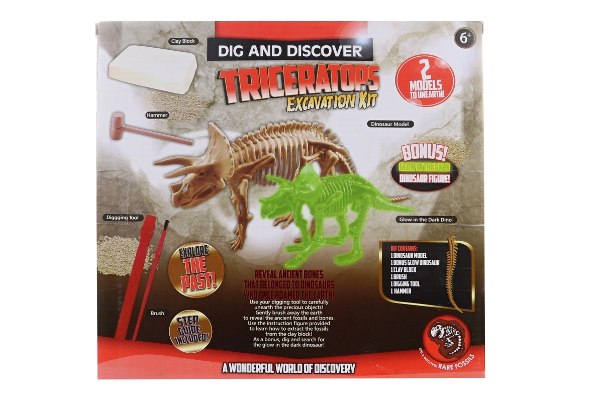Spremenite dnevno sobo v paleontološko najdišče. Otroci najprej previdno izkopljejo dele, nato sestavijo okostje triceratopsa iz 10 delov, zatem pa uživajo v magiji s figurico, ki sveti v temi. Set razvija fino motoriko, potrpežljivost in zanimanje za prazgodovino.