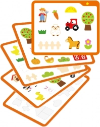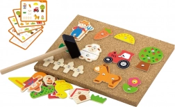 Barvne lesene oblike se s pomočjo žebljičkov pritrjujejo na trdno korkasto tablo – otroci po domišljiji sestavljajo živalice, traktor in kmeta.