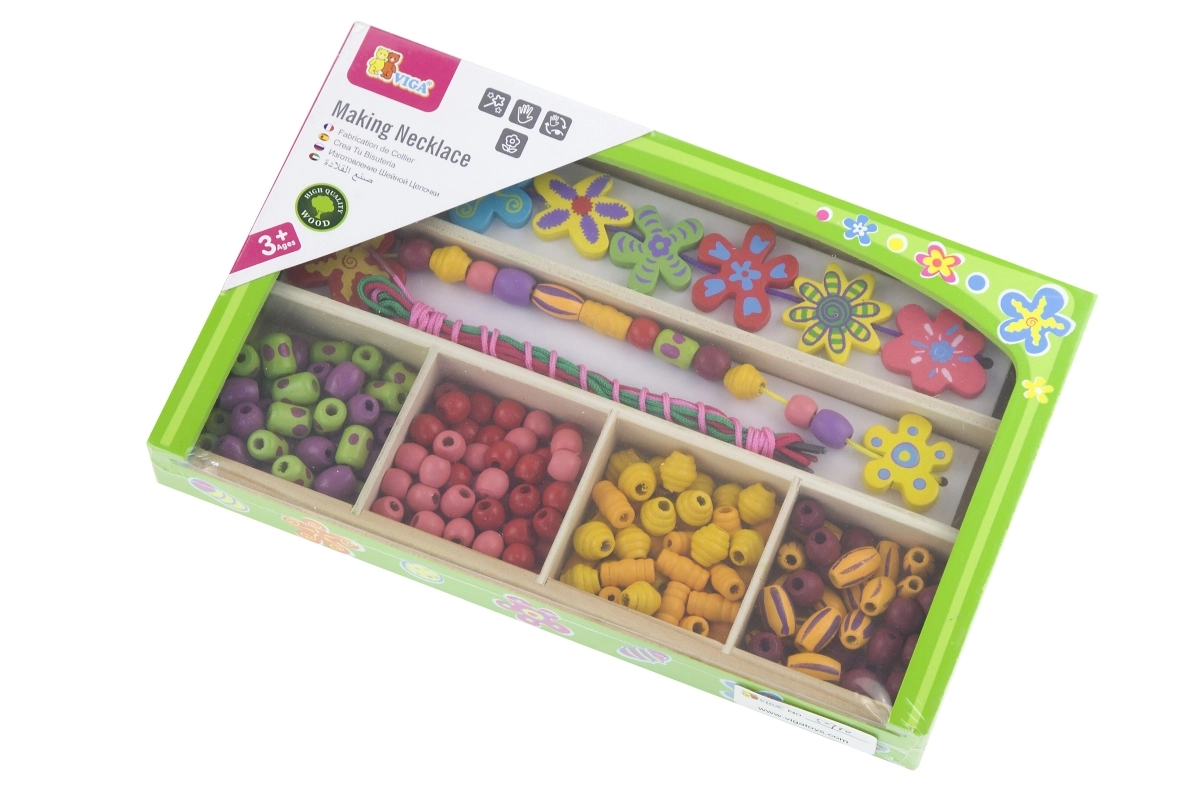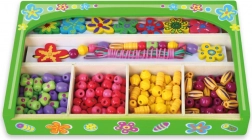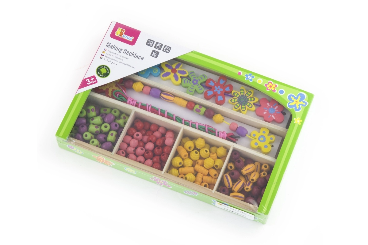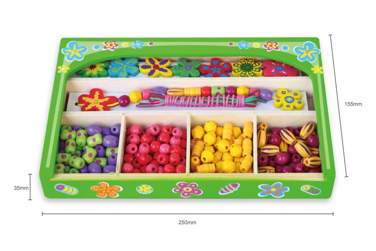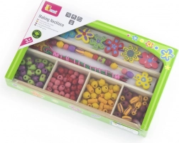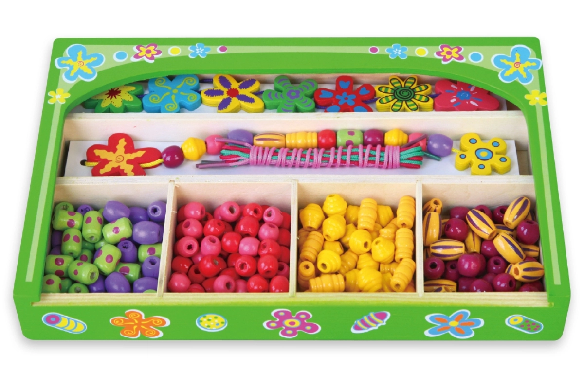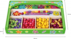 Ustvarite si lasten nakit s tem barvitim kompletom lesenih perlic z motivi rožic. Idealen za otroke od 3 let, razvija fino motoriko, kreativnost in koordinacijo oko–roka. Praktični predelki ohranjajo perlice pregledno razvrščene in omogočajo enostavno nizanje zapestnic in ogrlic.