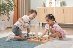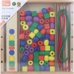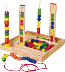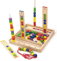 Ta premišljena Montessori igra podpira učenje skozi igro: otroci nizajo in sestavljajo perlice na paličice v zaporedju, ki ga določajo vzorčne kartice. Na zabaven način tako razvijajo koordinacijo oko–roka, zbranost in potrpežljivost, hkrati pa utrjujejo znanje barv, oblik in zaporedij.