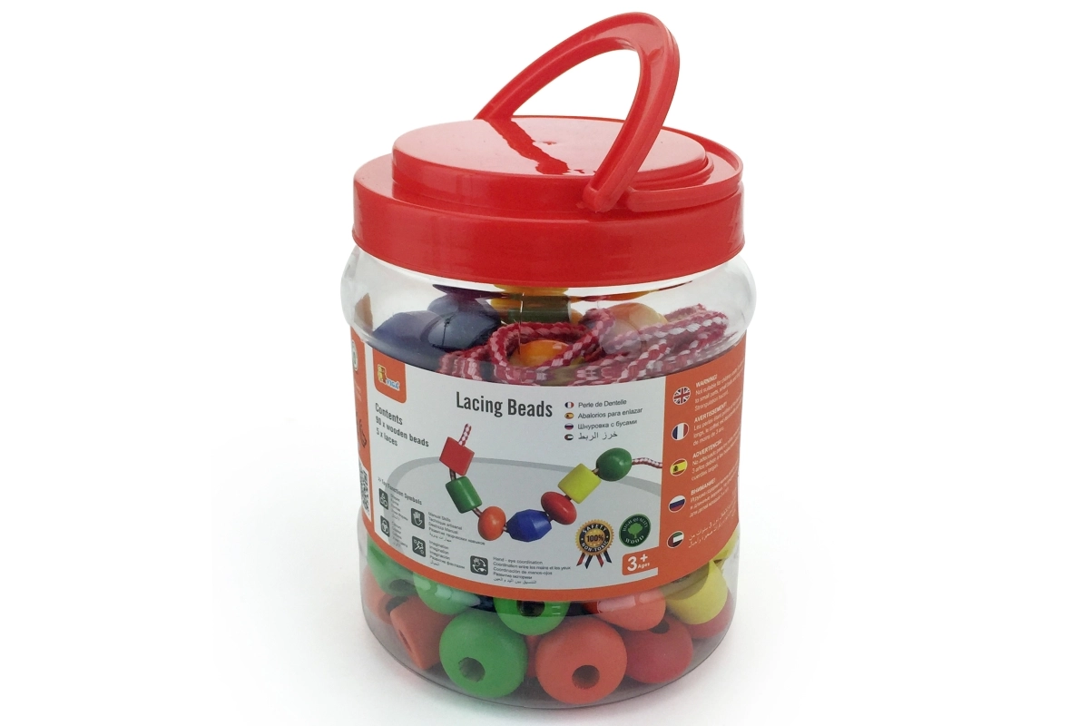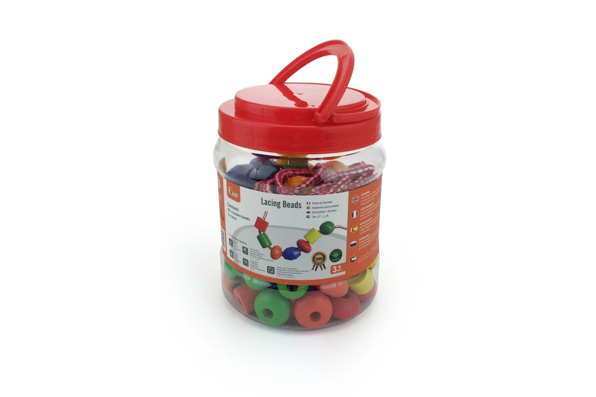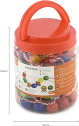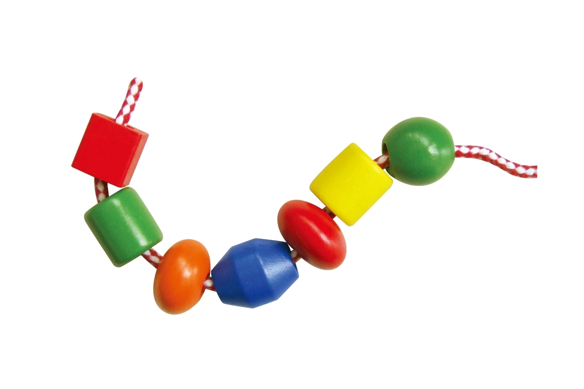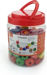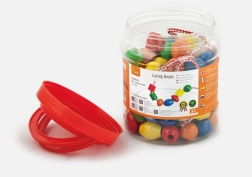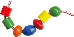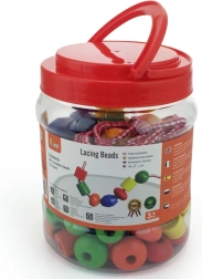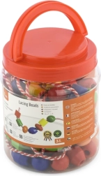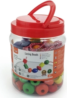 Plastična škatla vsebuje velike lesene kroglice in barvne vezalke, na katere lahko nizate kroglice. Velikost kroglice približno 2 x 2 cm, odvisno od vrste. Dimenzije pakiranja približno 16 x 12 cm. Vsebuje 90 kroglic in 5 vrvic. Starost 3+.