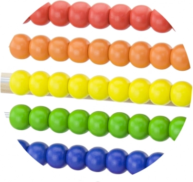 Deset vrst izrazito barvitih kroglic podpira vizualno zaznavanje, razvrščanje in prve računske naloge.