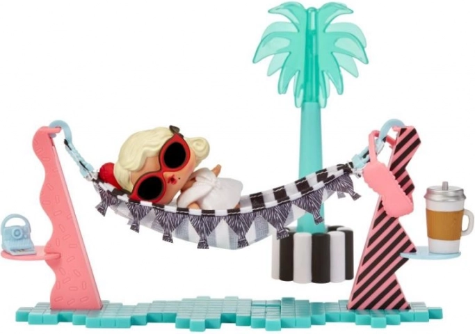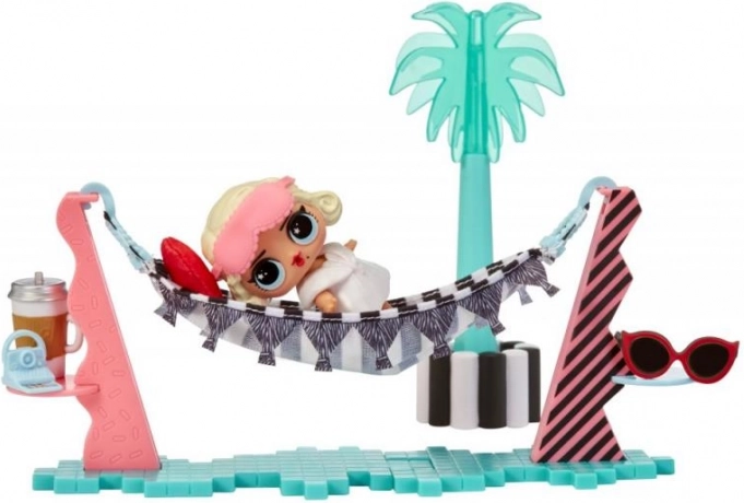Uživaj v počitniškem chillu z najljubšo punčko L.O.L. Surprise v 6. seriji pohištva z dodatki. Odpri in odkrij več kot 10 presenečenj, spremeni embalažo v samostojno igralno površino ter ustvari tropski kotiček z visečo mrežo, palmo in stilskimi dodatki. Združljivo z OMG Hišo 2, idealno za kreativno in domišljijsko igro.