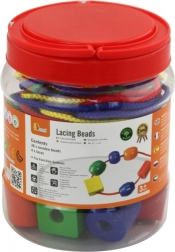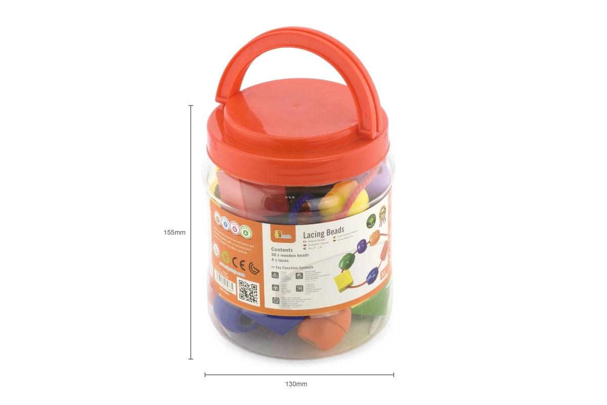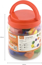 Ta set ekstra velikih lesenih kroglic je idealna igrača za zgodnji razvoj otrok. Z izrazitimi barvami in različnimi oblikami otroci vadijo razvrščanje, štetje in ustvarjalnost, hkrati pa krepijo prijem in zbranost. Velikost kroglic je prilagojena otroškim rokam, zato je navlačenje enostavno in zabavno.