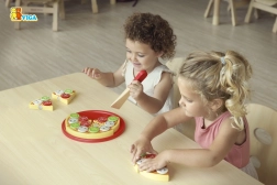 Zabavna lesena pica za rezanje s pladnjem in lopatko prinaša ure kreativnega igranja. Odstranljive sestavine in rezanje na kose razvijajo fino motoriko, koordinacijo oko–roka ter igro vlog malih kuharjev.