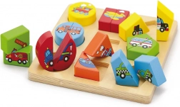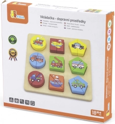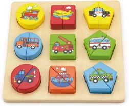 Lesene puzzle za najmlajše v češki škatli. Vsebuje 18 koščkov, iz katerih je mogoče sestaviti 9 slik. Mere enega koščka približno 4,5 × 2,5 cm. Mere embalaže približno 20,5 × 21 × 3 cm. Starost 18m+.