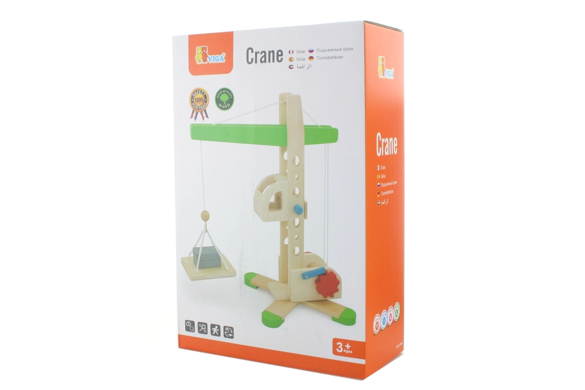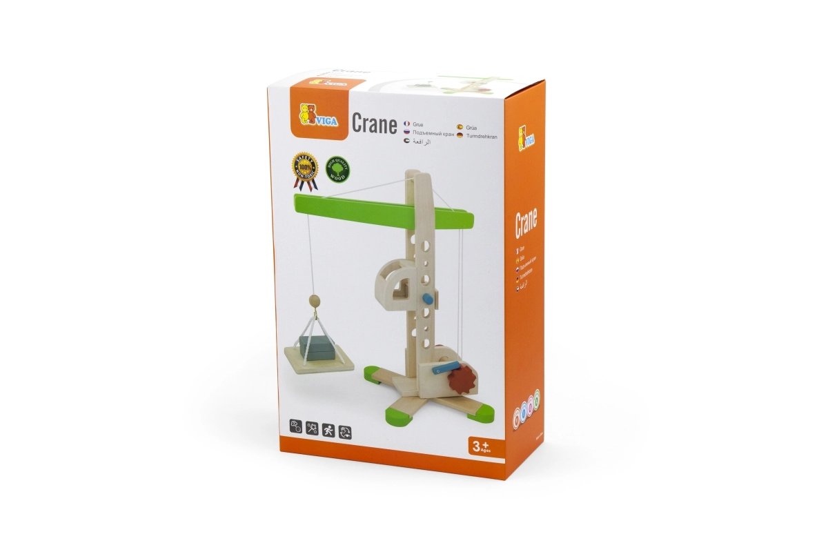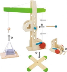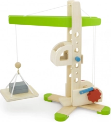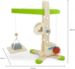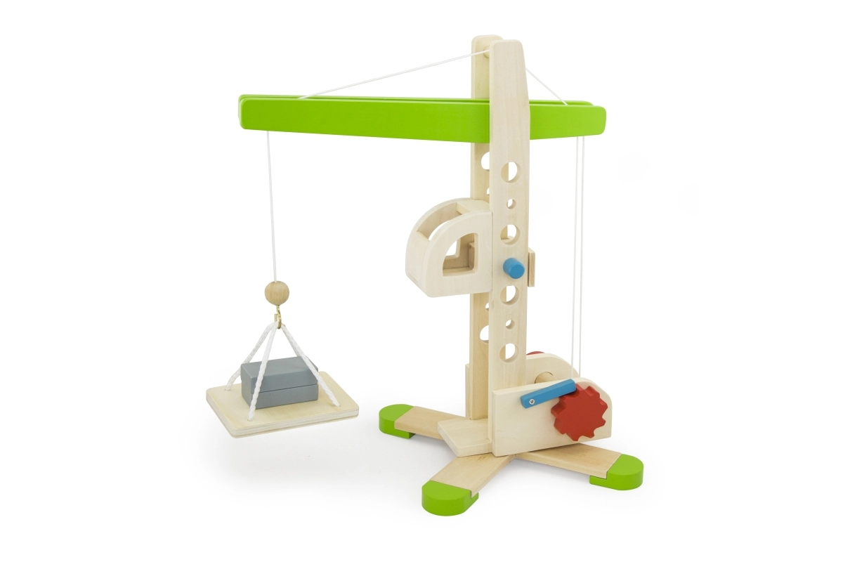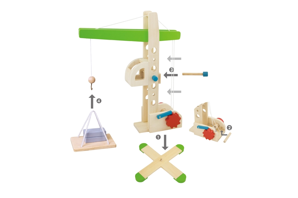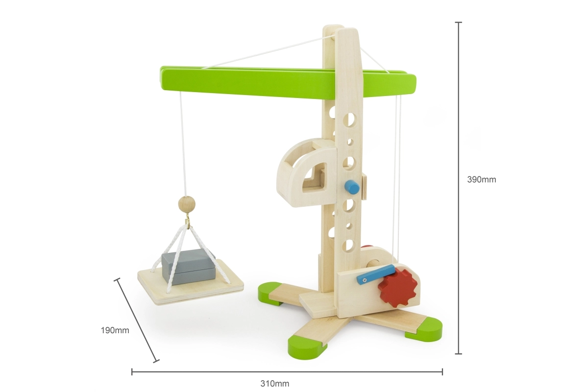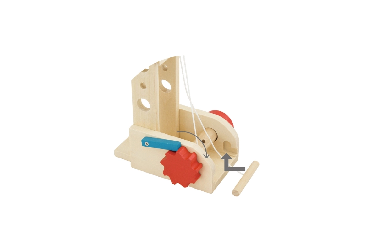 Otroci lahko z enostavnim vrtenjem navijalnega koleščka dvigujejo in spuščajo tovor. Mehanizem spodbuja koordinacijo oko–roka in omogoča gladko, varno delovanje.