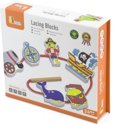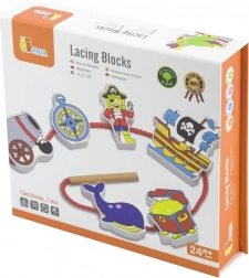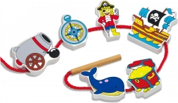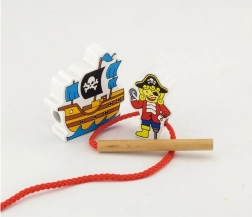 Zabaven komplet za najmlajše s piratsko tematiko razvija fino motoriko, koordinacijo oko–roka in kreativnost. Vsebuje 12 lesenih blokov in dolg trak za natikanje, pakirano v priročni škatli – služi kot shranjevalni box. Primerno od 24 mesecev.