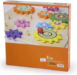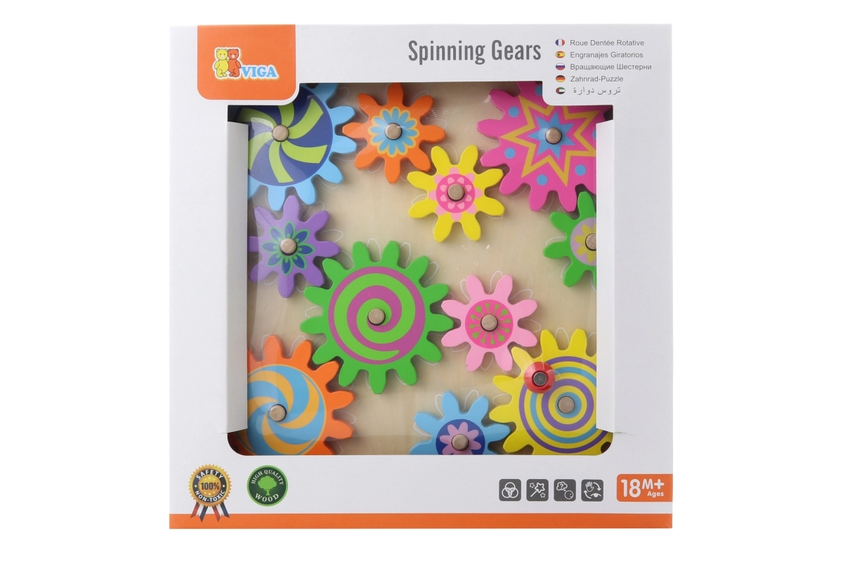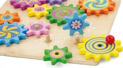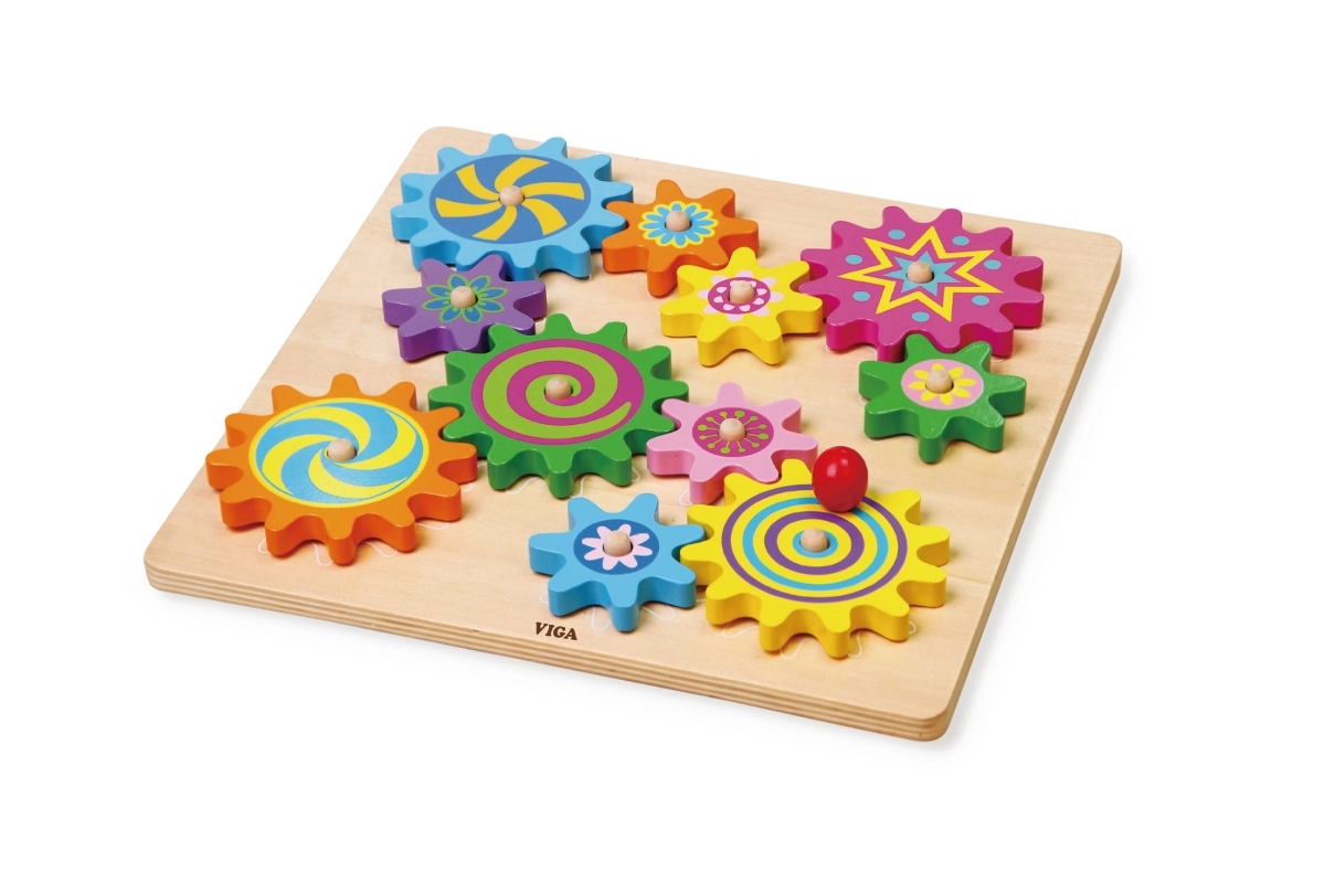 Ta pisani komplet lesenih zobniških kolesc na stabilni plošči bo razveselil male raziskovalce. Otroci nameščajo kolesca na zatiče, preizkušajo njihovo povezovanje in opazujejo, kako se po zasuku enega kolesc vsa gladko poženejo v gibanje. Igrača podpira koordinacijo oko–roka, logično razmišljanje in učenje vzroka in posledice.
