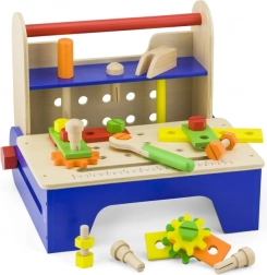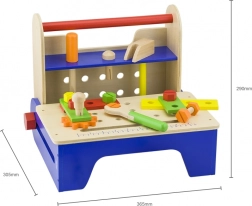 Ta leseni vijačni set je idealna izbira za prve mojstrske poskuse. Robustna lesena škatla se v hipu spremeni v stabilno delovno mizo, na kateri lahko otroci privijajo, sestavljajo in gradijo lastne stvaritve. Barvni deli spodbujajo raziskovanje in podpirajo koordinacijo oko–roka.