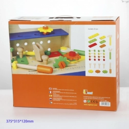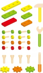 Vsi elementi so prilagojeni otroškim rokam in izdelani iz trpežnega lesa. Zahvaljujoč bogatemu izboru vijakov, matic in ploščic nastajajo neskončne možnosti kombinacij, ki razvijajo domišljijo in potrpežljivost. Komplet je odličen za samostojno igro ali skupno ustvarjanje s starši.