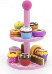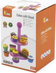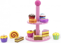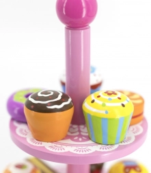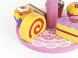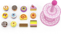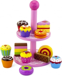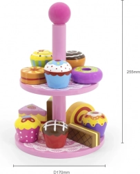 Ta stilski komplet lesenih sladic na dvonadstropnem stojalu je idealen za igro kavarnice, čajanke ali otroške slaščičarne. Kakovostno izdelani leseni koščki v živahnih barvah vabijo k raziskovanju in urijo koordinacijo roka–oko.