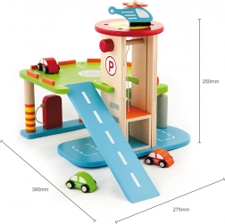 Ta kakovostna lesena garaža ponuja več nivojev parkiranja, pristajalno ploščad za helikopter ter praktično dvigalo za enostavno premikanje avtomobilčkov med nadstropji. Zahvaljujoč premišljeni zasnovi s stezami, oznakami in dodatki si otroci urijo koordinacijo gibov in razvijajo svojo domišljijo.