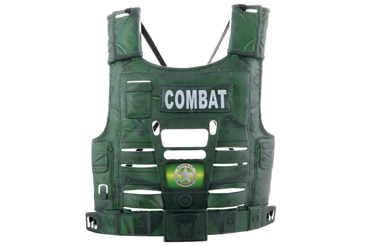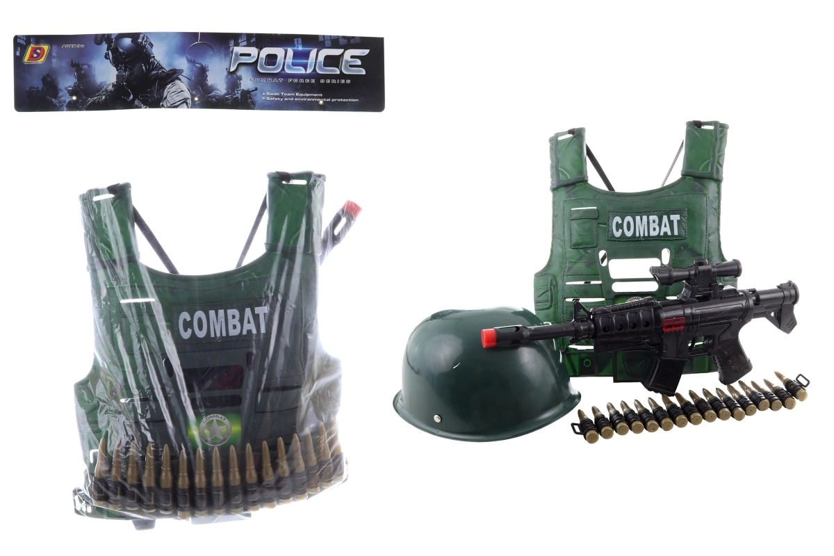 Ta otroški vojaški komplet je zasnovan za varno in ustvarjalno igro. Lahka plastična čelada in jopič z elastikami se zlahka namestita in dobro držita, tako da se lahko otroci popolnoma potopijo v svoje pustolovske zgodbe. Puška in nabojniki dopolnjujejo avtentičen videz, pri čemer je vse prilagojeno otroškim rokam.
