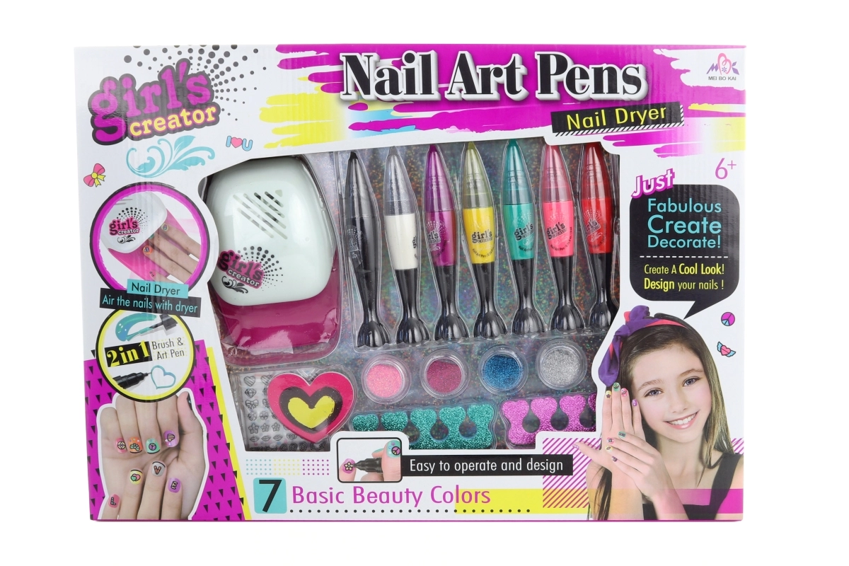 Ta zabaven in enostaven komplet za nohte omogoča otrokom, da izrazijo svojo ustvarjalnost in ustvarijo izvirne dizajne kot iz profesionalnega salona. Zahvaljujoč dvostranskim lakom z nežnim čopičem in natančnim peresom je okraševanje hitro in udobno, medtem ko sušilnik za nohte pospeši sušenje in skrajša čakanje.