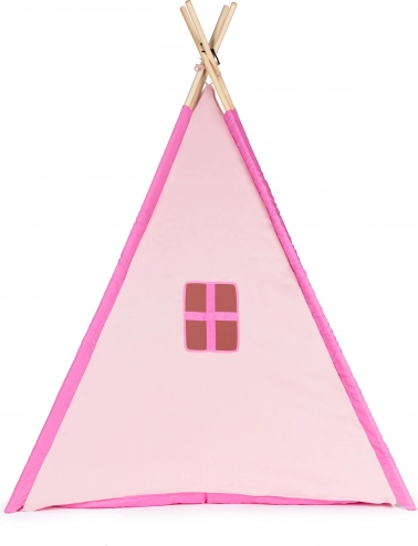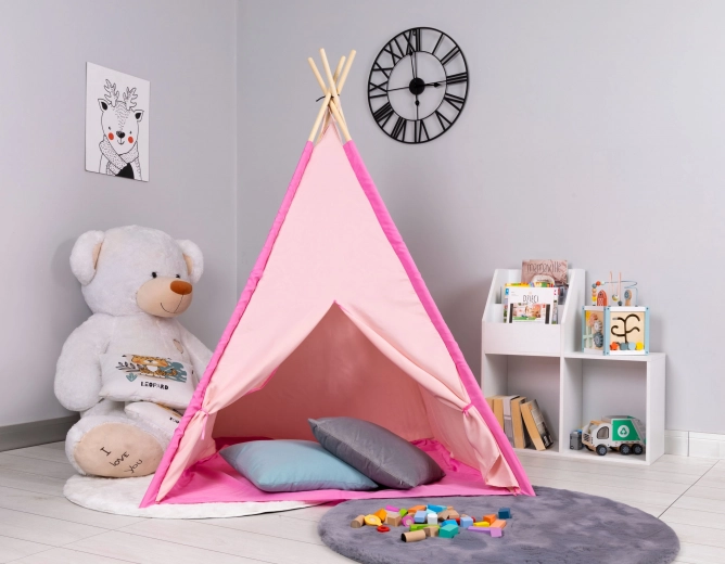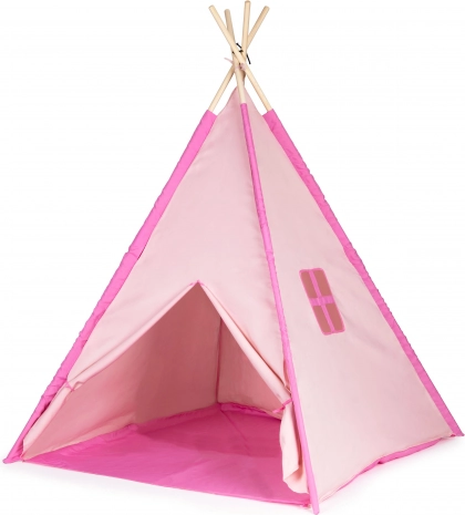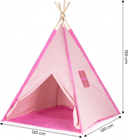 Šotor teepee velikosti približno 120 x 120 x 150 cm. Šotor lahko uporabljate doma v otroški sobi ali poleti zunaj na vrtu. Otroci se bodo ob igranju in skrivanju izvrstno zabavali. Dimenzije pakiranja približno 10 x 10 x 90 cm. Starost 3+ Barva: rožnata/modra