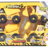 Zgradite svoje gradbišče z barvitim kompletom vozil na vijake. Otroci zlahka sestavijo in razstavijo nakladalnik, bager, mešalnik in prekucnik s priloženim izvijačem in ključem. Igra spodbuja ustvarjalnost, koordinacijske spretnosti in uči potrpežljivosti na zabaven način.
