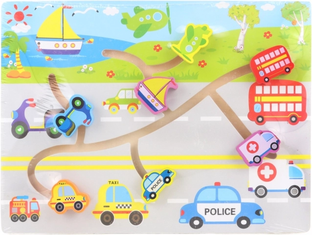Ta kakovosten leseni labirint otrokom prinaša veselje pri odkrivanju sveta prometa. Otroci premikajo barvne koščke z motivi avtomobilov, avtobusov ali letal po označenih poteh ter tako vadijo potrpežljivost, zbranost in prostorsko predstavo. Trdna lesena plošča zagotavlja stabilnost in dolgo življenjsko dobo.