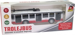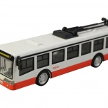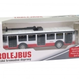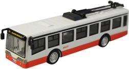 Odkrijte podrobno izdelan trolejbus v tradicionalni rdeče-belo-črni kombinaciji, kot jo poznamo iz nekaterih čeških mest. Model je izdelan iz kakovostne kovine, dopolnjene s plastičnimi elementi, zato je hkrati trden in lahek za otroško roko. Zahvaljujoč navijanju za povratno vožnjo se trolejbus po spustu sam zapelje in ponudi veliko zabave.