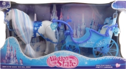 Konjiček z modrim kočijem. Po vstavitvi baterij konjiček hodi, predvaja glasbo in na kočiji svetijo laternice. Napajanje z 2 baterijama AA (nista priloženi). Dimenzije pakiranja približno 56 × 30 × 19 cm. Starost 3+