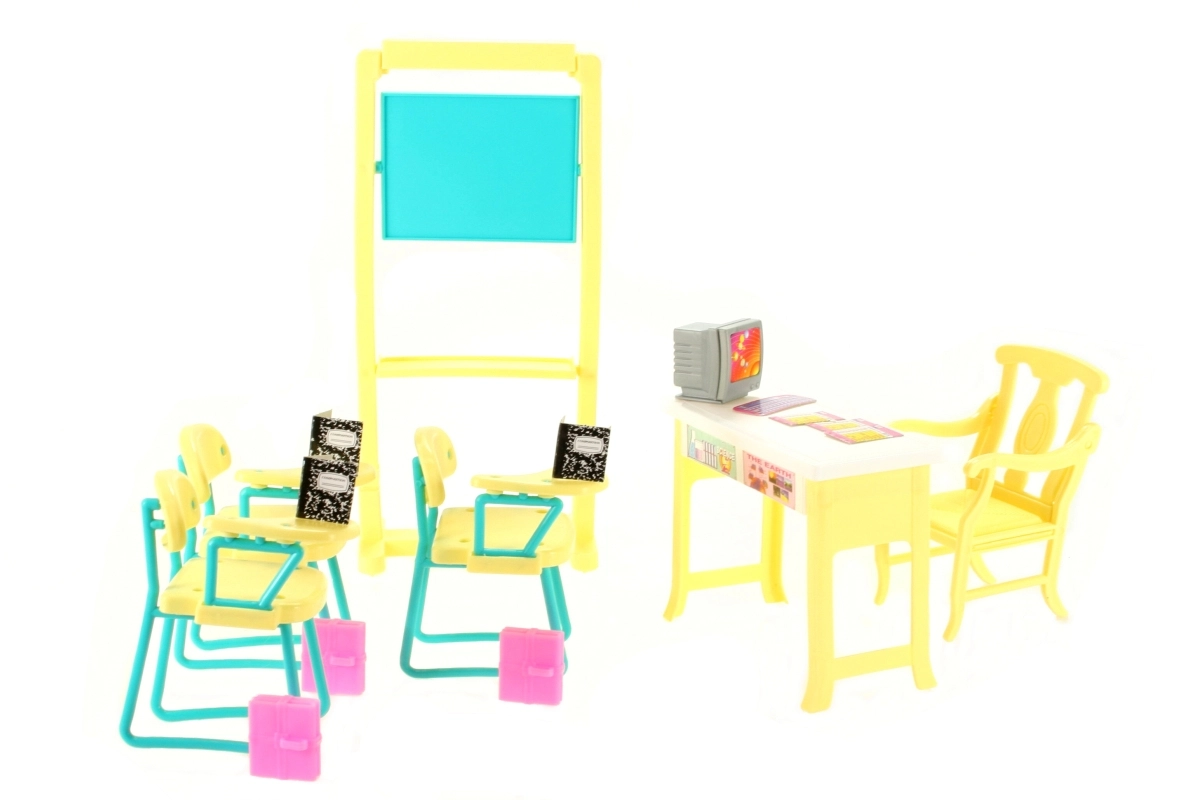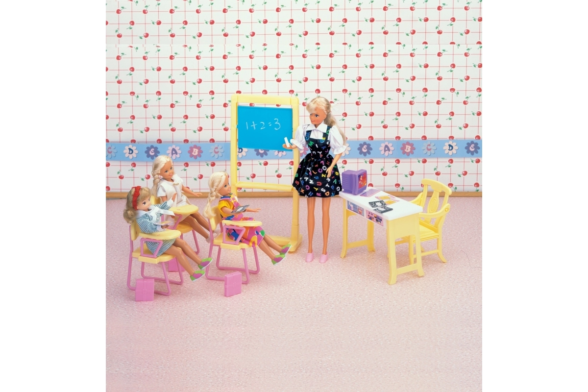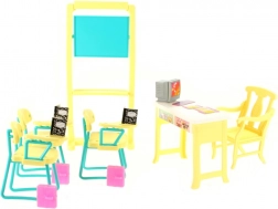 V kompletu so prostorna tabla, učiteljski kotiček z računalnikom in stoli za učence. Zaradi kompaktnih mer je set združljiv z običajnimi punčkami in ga je enostavno pospraviti.