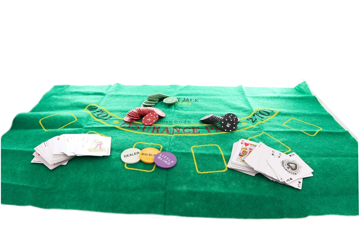 Set vključuje žetone v različnih barvah in vrednostih, igralne karte in gumb kontrolorja za avtentično igralno izkušnjo.