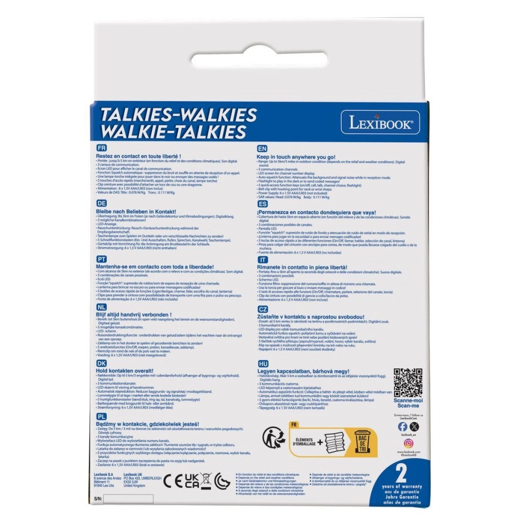 Spremenite komunikacijo v zabavo in večjo varnost. Te digitalne radijske postaje olajšajo dogovarjanje otrokom in odraslim pri igri, pohodništvu ali kampiranju, tudi tam, kjer ni mobilnega signala. Zahvaljujoč dosegu do 5 km (odvisno od terena in vremena) ter 3 kanalom se zlahka povežete med več enotami – le nastavite enak kanal.