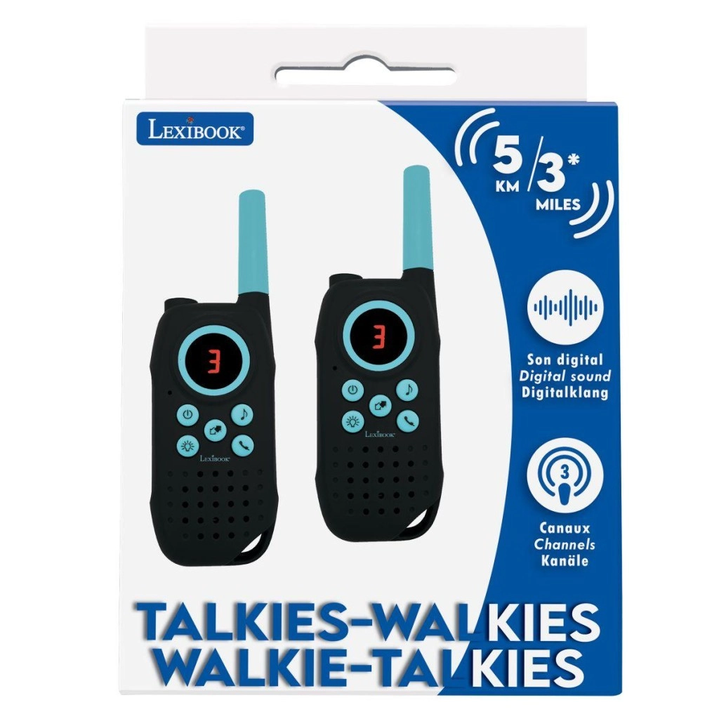 Ostanite v stiku pri igri, na izletih in pri kampiranju z digitalnimi otroškimi radijskimi postajami s signalom do 5 km, 3 komunikacijskimi kanali in uporabniku prijaznimi gumbi. Ponašajo se z digitalnim zvokom, LED-zaslonom, LED-svetilko in funkcijo squelch za zmanjšanje šuma. V paketu sta 2 enoti z odstranljivim sponkom za pas.