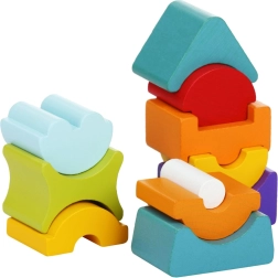 Zaobljeni deli omogočajo gradnjo stolpa naravnost ali z nagibom v stran. Otroci pri vsakem poskusu urijo potrpežljivost, koordinacijo in prostorsko predstavo.