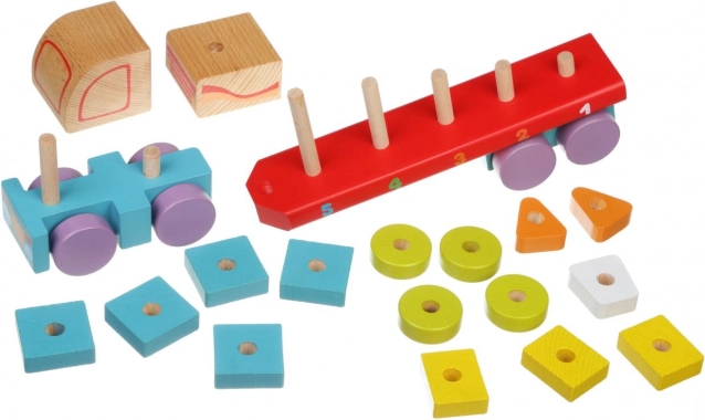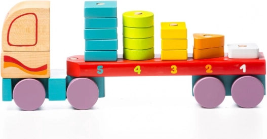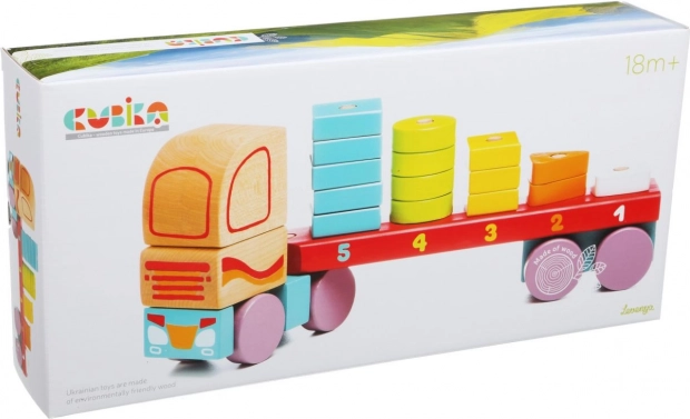 Lesena sestavljanka CUBIKA Tovornjak z geometrijskimi oblikami je več kot le igrača. Z 19 barvnimi deli se lahko otroci učijo razvrščati oblike in barve, kar razvija njihove senzomotorične sposobnosti. Vsak del je zasnovan tako, da se prilega drugim, bolj izkušeni graditelji pa lahko pravilnost števila zloženih delov preverijo po številkah na podvozju tovornjaka.