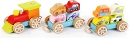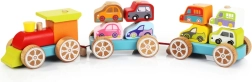 Ta barvna lesena sestavljanka vsebuje 14 delov, iz katerih lahko otroci sestavijo vlak z dvema vagonoma in osmimi avtomobilčki. Igrajo se ne le z posameznimi deli, temveč tudi razvijajo svoje senzomotorične sposobnosti, logično razmišljanje in kreativnost.