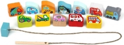 Set Cubika za nizanje prevoznih sredstev prinaša 12 lesenih elementov z različnimi prevoznimi motivi in eno 45 cm dolgo vrvico z lesenim klinom. Otroci se lahko s pomočjo 8 priloženih predlog učijo spomina in spretnosti ter se zabavajo z izobraževalno igro.