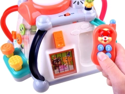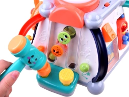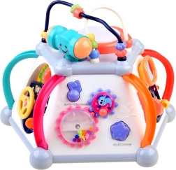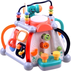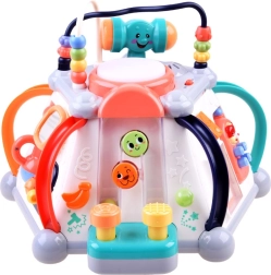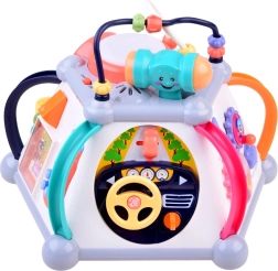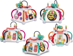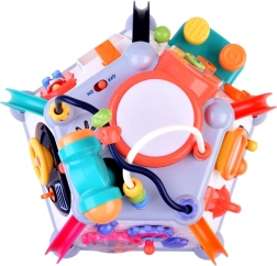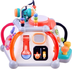 Večkocka HOLA prinaša bogat nabor aktivnosti za najmlajše. Vsaka stranica ponuja drugačen tip igre – od vožnje avtomobilčka, zobnikov s svetlobnimi učinki in melodijami, do mikrofona z osvetljenim »televizorjem«. Zgornja stran skriva labirinte s kroglicami, svetleči boben in prostor za shranjevanje kladivca. Vse je zasnovano za majhne otroške roke in varno raziskovanje.