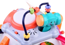 - Stranica s kladivcem: udarci po gumbih premikajo kroglico po prosojnem tunelu, spremljajo jih zvoki in luči; dodatno premična banana in jabolko na samonavijalni vrvici.