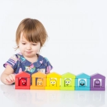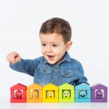 Šest hišk in njihovi barviti prebivalci spodbujajo otroke k ujemanju in razvrščanju. Otroci si naravno usvajajo barve ter razvijajo logiko in pozornost.