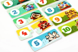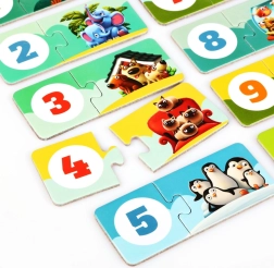 Odkrijte igrivo učenje s sestavljanko PUZZLIKA, ki otroke popelje skozi prve korake v svet števil. Vsak par povezuje ilustracijo skupinice živalic z ustrezno številko, kar naravno razvija štetje od 1 do 10, vidno zaznavanje in razumevanje povezav. Veliki in trdni kosi so otrokom enostavni za prijemanje in sestavljanje.