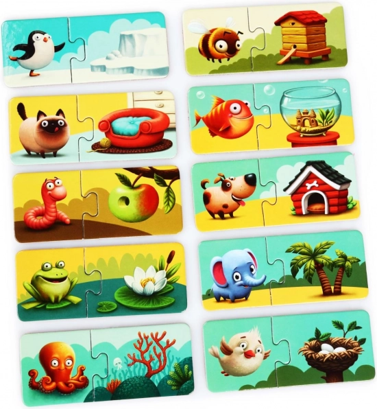 Zabaven set Puzzlika Moj dom uči otroke povezovati živali z njihovimi domovi. Vsebuje 20 velikih trdnih kosov, ki tvorijo 10 parov. Podpira logično razmišljanje, razvoj fine motorike, spoznavanje živali in okolja ter vizualno zaznavanje. Izdelano iz vzdržljivega večplastnega kartona z bleščečo površino, enostavno za čiščenje in idealno za predšolske otroke.