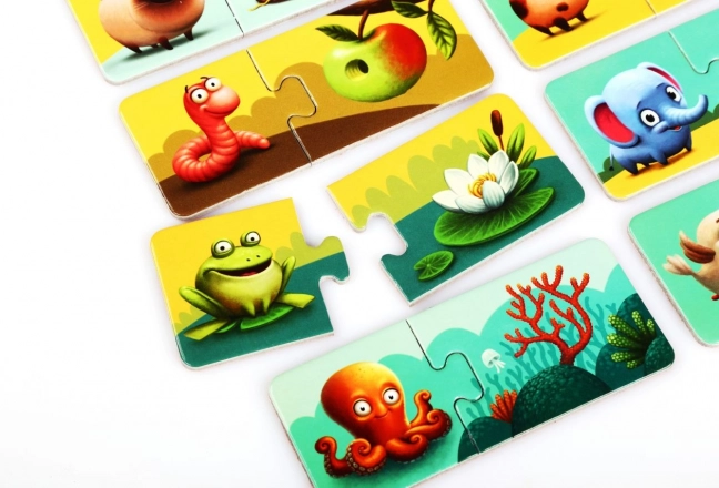 Set vsebuje 20 trdnih kosov, ki tvorijo 10 tematskih parov. Ilustracije so izrazite in barvite, da zadržijo pozornost in spodbujajo raziskovanje. Kakovosten ekološki karton z bleščečo površinsko obdelavo je vzdržljiv in ga je mogoče obrisati z vlažno krpo.